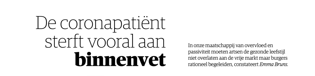 “De werkelijke verschillen in de mortaliteit van de coronapandemie worden bepaald door het binnenvet. Het verschil tussen Amerika, Engeland en landen als Zweden en Japan wordt wellicht niet door hun coronamaatregelen bepaald, maar wel door wat ze dagelijks ’s avonds op hun bord scheppen. Dat binnenvet, officieel visceraal vet, is vet dat zich ophoopt rondom onze organen in de buik en daar een chronische ontstekingsreactie veroorzaakt. Op de lange termijn leidt dit tot allerlei aandoeningen zoals diabetes type II, hypertensie, hypercholesterolemie. Ook bevordert het een risico op diverse soorten kanker en, u raadt het al, het leidt tot een ernstig verloop wanneer besmetting met corona plaatsvond….. Het goede nieuws is dat we in Nederland tientallen scanners hebben staan die met minder straling dan een normale CT- scan, kunnen bepalen of u, visceraal obees bent, of uw echtgenoot of uw broer. Op dit moment is er echter maar één bedrijfje dat een vergunning heeft om zo’n scan te maken.”